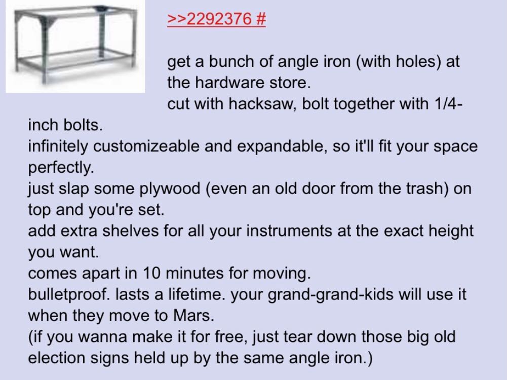 Similar to the prev. suggestion, at work, they build a lot of shit out of extruded aluminum like this that you cut to size and screw together with connectors, which may be another option for a shelf or wall rack system: