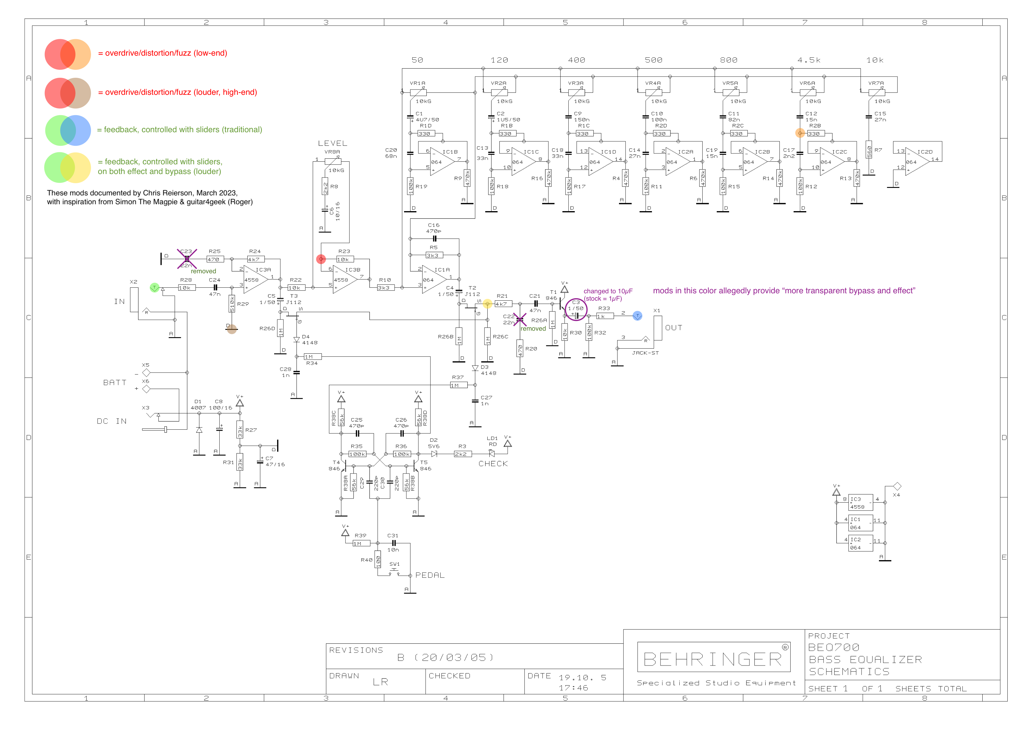 One thing that's kind of neat about the BEQ700 is it's a near-exact replica of the much more expensive (albeit more rugged) Boss GEB-7, so mods for this pedal should work for that one, too. I'd say if you have the BEQ700, try these mods out: even if you screw it up somehow, the BEQ700 is super cheap so it's easy to replace!