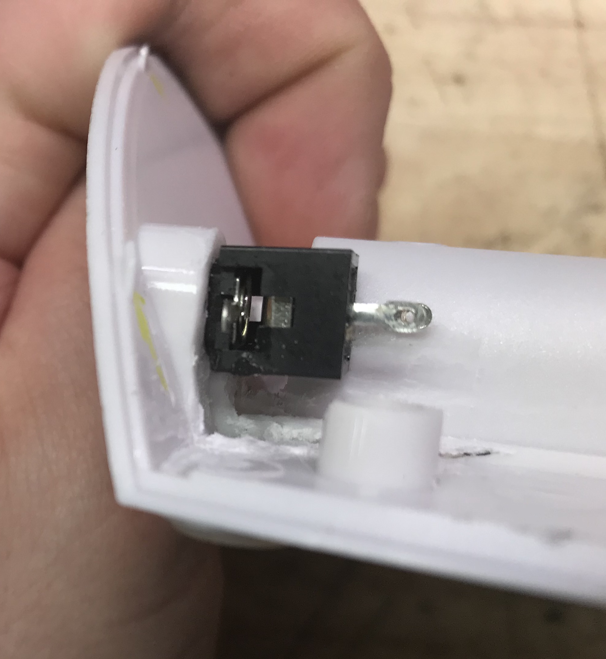Dremel/heat to fit a 1/8xe2x80x9d jack where the DC jack once was: