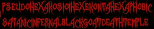 Jump to navigationJump to searchPseudohexakosioihexekontahexaphobic_Satanicinfernalblackgoatdeathtemple_logo.jpg (522 × 100 pixels, file size: 18 KB, MIME type: image/jpeg)
